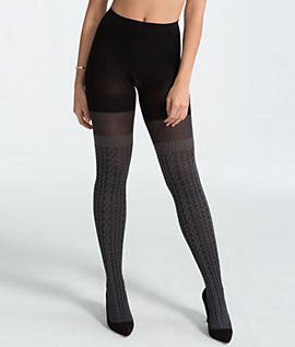These cable-knit SPANX tights have a built-in shaper that flattens the stomach, rear, and thighs. Sheer panels.