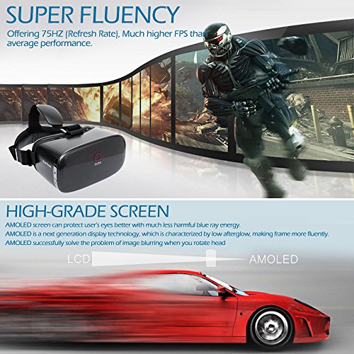 -. Feature : DeePoon E2 is equipped with AMOLED screen with low afterglow, makes frame more fluently. / AMOLED screen can protect user's eyes better with much less harmful blue ray energy. / Offering 75HZ (Refresh Rate), Much higher FPS than average performance. / High-quality Non-spherical Optical Lense of DeePoon E2 is made by Japan, lens is more pure, offering distortionless image. / DeePoon E2 Combines optical amplification technology and image anti-distortion technology together, and Deepoon E2 owns amazing 120ºFOV, which can offer wonderful immersive sense.