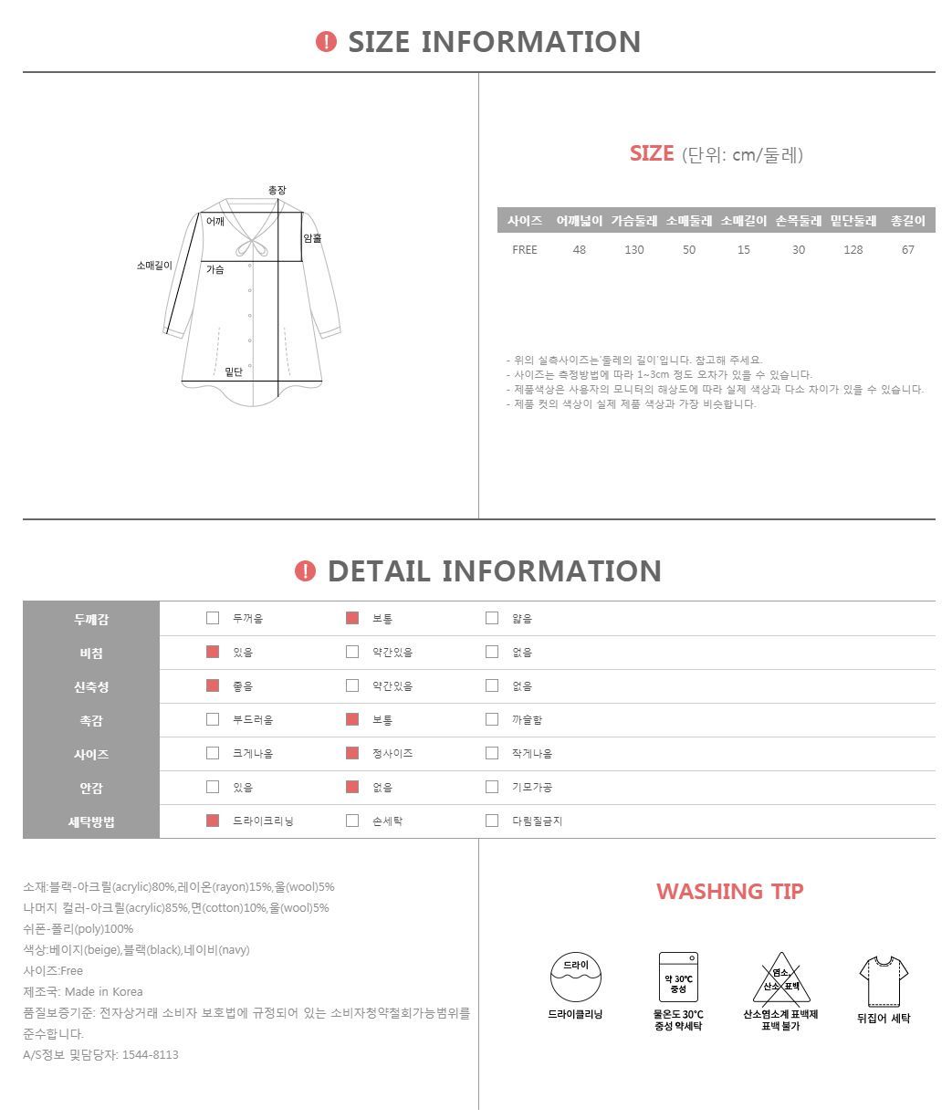 셀르베 니트배색 블라우스 #44126 여유있는 핏에 세련된 나염패턴이 들어간 셀르베 니트배색 블라우스 소개할께요 롱티셔츠 느낌으로 제작되어 편안하게 스키니나 밴드팬츠에 매치해서 입기 좋아요! 앞면은 쉬폰사 얇은 블라우스 소재감이라 시원해요^^ 달라붙지 않는 루즈핏이라 편안하게 입으면서도 군살을 가려줘 슬림한 느낌으로 착용하시기 좋아요~ 전체적으로 나염이 들어가 있어 굉장히 멋스러운 느낌에 뒷면은 여름니트로 시원한 소재감이에요 실크는 아니지만 실크느낌으로 촤르르한 소재감이 부드럽고 고급스러운 느낌! 어떠한 하의와의 매치도 부드럽게 잘 어울려 스타일링 하실 때 큰고민 없이 이지하게~ 추천드려요^^ COLOR,SIZE TIP 컬러는 베이지,블랙,네이비으로 구성되어 있으며, 모델의 착용 컬러는 네이비 입니다. 사이즈는 FREE(44-66)사이즈로 진행되오니 고객님의 체형에 맞게 선택하셔서 예쁘게 착용하시길 바랍니다.