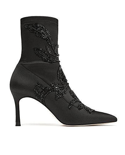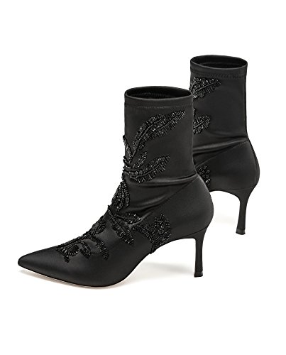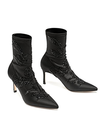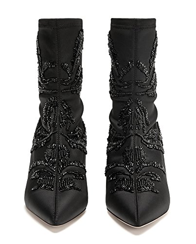 Product Description Black satin ankle boots. Embroidered detailing on the upper. Stiletto heels. Side zip closure. Pointed toes. Heel height of 7.5 cm. / 2.9 inches Official brand size equivalence for Women Shoes. Size 35 | USA 5 ? ?|?UK 2 Size 36 | USA 6 ? ?|?UK 3? Size 37 | USA 6.5 |?UK 4? Size 38 | USA 7.5 |?UK 5? Size 39 | USA 8 ? ?|?UK 6 Size 40 | USA 9 ? ?|?UK 7? Size 41 | USA 10 ?|?UK 8? Size 42 | USA 11 ?|?UK 9? Size 43 | USA 12 ?|?UK 10 0