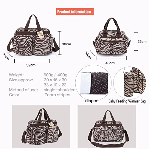 Studio : Fy-Light Publisher : Fy-Light Binding : Baby Product Product Description Fy-Light purses the best quality of diaper bag and devotes to providing the best product and service to customers Features: Stylish Zebra pattern totally on-trend at the moment,not only can be used as a diaper tote but also as an everyday tote,suitable for shopping,restaurant and traveling Specially designed side TISSUE POCKET,offering quickly access to wipes when spills happen,bringing much convenience to mom dad Zip down front pocket provides instant access to a changing pad, esily to change baby's daiper on the way The universal stroller straps allow you to convert your baby bag into a stroller organizer,offering convenient and comfortable easy-carrying on the go. Spacious interior features multiple storage pockets for baby's necessities and zipper closure pocket to secure mom's or dad's keys, wallets,cellphone and more. Package Included: l???There are two diaper bags inside the poly bag l???There is one hangtag attached to each diaper bag l???Accessory:change mat x1, detachable insulated bottle holder x1, detachable shoulder strap x2