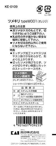 -. Binding : Health and Beauty -. Brand : Kai -. EAN : 0787734591812 -. Feature : Small sized straight blade and handle / Research indicates trimming with small, straight blade trimmers prevents nail cracking; Designed for women who have thin and weak nails / Multiple colors to choose from / Stainless steel nail file made by etching provides smooth filing and easy shaping -. IsAdultProduct : 0 -. Label : Kershaw -. Manufacturer : Kershaw -. Model : 000KE0109 -. MPN : 000KE0109 -. PackageQuantity : 1 -. PartNumber : 000KE0109 -. ProductGroup : Beauty -. ProductTypeName : BEAUTY -. Publisher : Kershaw -. Studio : Kershaw -. Title : Kai 000KE0109 Nail Clipper, Orange, W001 -. UPC : 785479198549