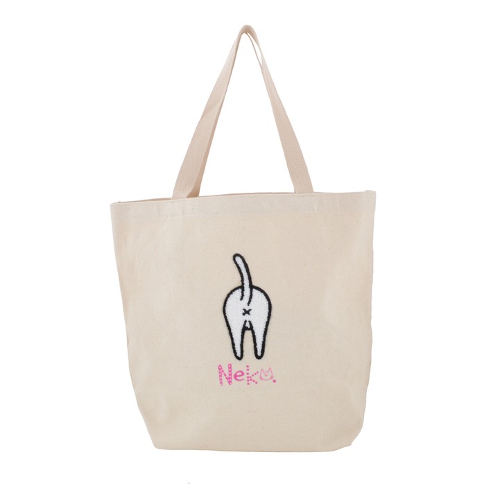 ナチュラルなコットン生地に大人気!もこもこ感がカワイイ~サガラ刺繍で人気のネコどっとキャラクターをデザインしたトートバッグ。猫ちゃん好きにはたまらないアイテムです。コットン生地は、とっても軽くて使い勝手抜群!肩掛けもOKでA4サイズ対応なので通勤・通学はもちろん、休日のショピングにと、デイリーに活躍してくれそうです。ギフトとしてもオススメです。