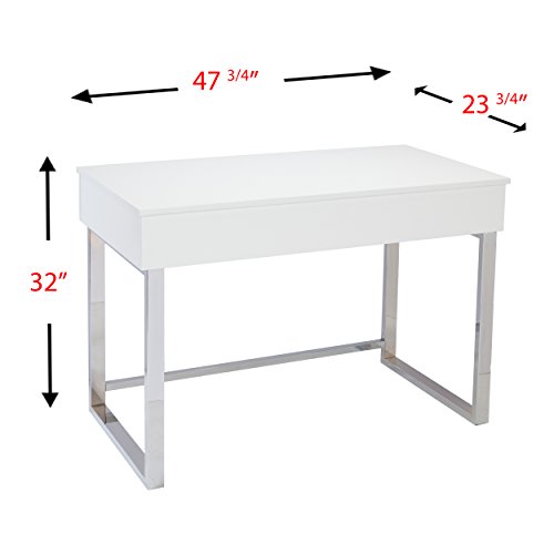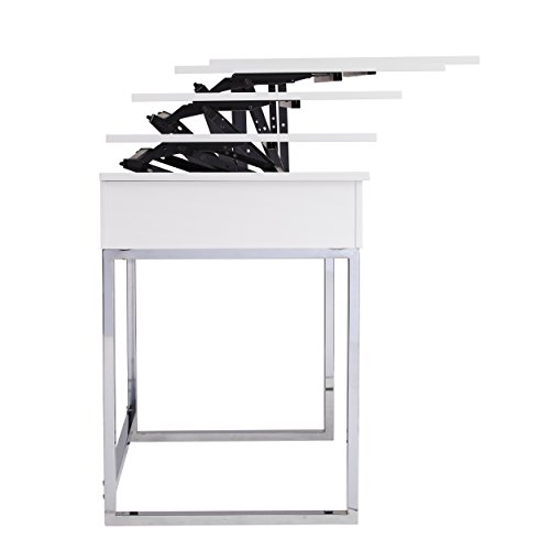 -. Feature : HEIGHT ADJUSTABLE - Choose from 1 sitting position and 4 different standing positions for ergonomic support and comfort. Start in a sitting position and quickly convert to a standing computer workstation in seconds. / HIDDEN STORAGE - Moving to a standing workstation reveals hidden storage beneath the tabletop. Store power cords, pens, pencils, notepads, and more. / DUAL MONITOR - Optimally designed for laptop use, but fully capable of hosting dual-monitor setups with keyboard and mouse. This desk measures 47.75" in length while being 23.75" deep and fully extends to 41.75" in height. / CONTEMPORARY STYLE - Features high gloss white w/ chrome legs for your work or home office. The hidden compartment feature allows for a minimalist look and feel by storing items unseen. / ASSEMBLY INSTRUCTIONS - Your desk comes with instructions on assembly and all of the necessary hardware. While sturdy, this lift top desk can be bolted into the wall using included brackets and screws. Supports up to 30lbs. (desktop); 30 lbs. (storage). Tools not included: No.2 Philips Screwdriver, Hammer, Power Drill.