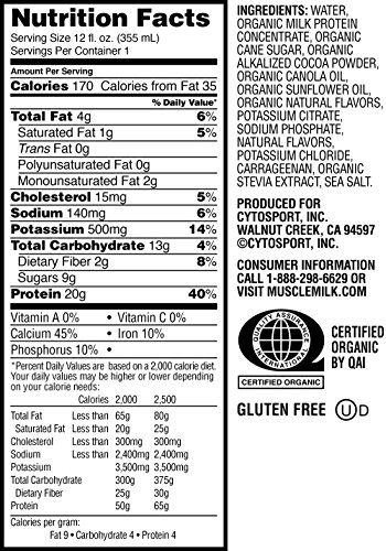 NOURISH YOURSELF – MUSCLE MILK Organic Ready-to-Drink protein shakes provide 20 grams of high quality organic protein per serving to help fuel workout recovery, provide sustained energy and help build strength in a gluten and soy free formula