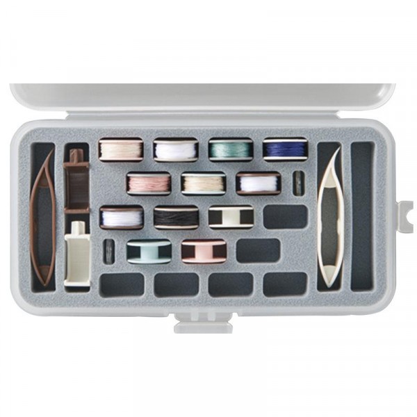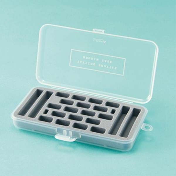 タティングシャトル・ボビン(シャトル、ボビン、ストッパー、ワッシャー)が一式収納できます。18個のボビンが収納可能です。スポンジが糸をホールドするので、糸がほどけず絡みにくいです。透明なケースなので、巻いている糸が一目で分かります。 |