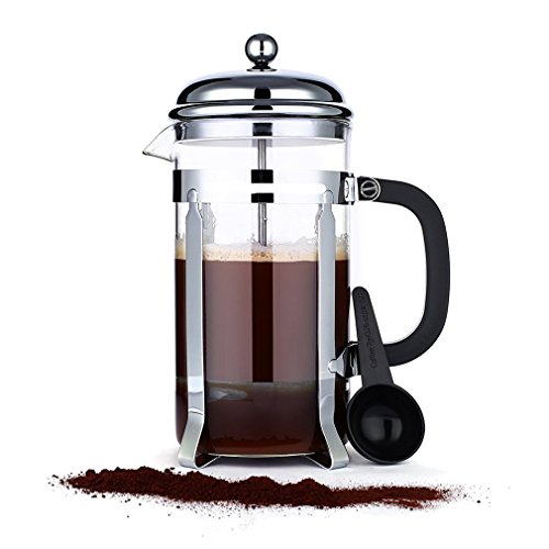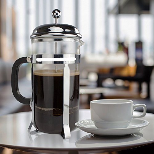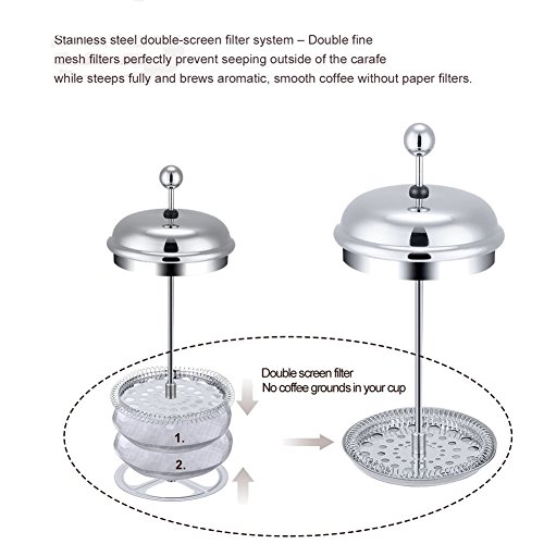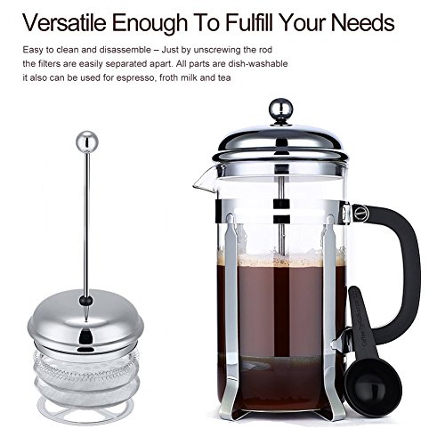 Product Description French Coffee Press Tea Maker, Coffee Pot, with Filtration and Stainless Steel Heat-Resistant Borosilicate Glass, 1 Liter (34 Ounce For 8 Cup) Our French press coffee maker is the simplest of all brewing system. The right temperature will bring the optimal extraction power for the essential oils in the beans to develop their full flavor profile in just a few minutes. Functional features - High quality pot body Adopt high-quality borosilicate heat-resistant glass, crystal transparent, it's able to withstand instantaneous temperature difference from - 20° to 150° - Duck mouth filter It will not let the coffee fall along the edge of the kettle, it can effectively prevent the liquid from backflowing. - Filter The French Coffee Press use food grade PP material, which kann filter the tea-leaves and used coffee grounds. - Single-layer filter Stainless steel filter, perfect filter impurities, keep the most genuine flavor of coffee. A must have in your life! If you enjoy flavorful coffee from a French press coffee maker, this is your must have! It is a genuinely elegant product and fits well in any modern kitchen. Order our french coffee press now and open your wonderful coffee journey right now. Specification Material: stainless steel borosilicate glass Length x Width Size: 150x95mm Height: 225x355mm (min-max) Packing size: 155x155x255mm Weight: 622g Color: Silver transparent What you get 1 x French Coffee Press Maker 1 x filter 1 x spoon 0
