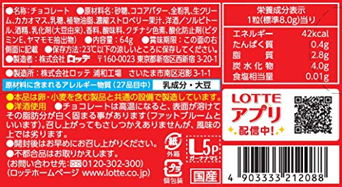 原材料:砂糖、ココアバター、全粉乳、生クリーム、カカオマス、乳糖、植物油脂、濃縮ストロベリー果汁、洋酒/ソルビトール、酒精、乳化剤(大豆由来)、香料、酸味料、クチナシ色素、酸化防止剤(ビタミンE、ヤマモモ抽出物)