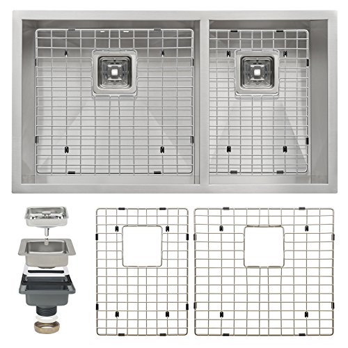 Perfetto Kitchen and Bath 32" x 18" x 9" Handmade Undermount Double Bowl 18 Gauge Stainless Steel 60/40 Kitchen Sink with Drain and Dish Grid