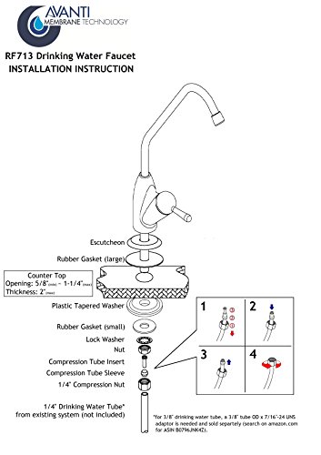 fits opening between 5/8” and 1-1/4”; fits countertop up to 1-7/8" thick; connected with 1/4” drinking water supply tube (not included); for 3/8" supply tube, a quick-connect adapter (ASIN B0796JNK4Z) is needed and sold separately