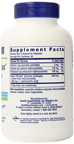 -. Binding : Health and Beauty -. Brand : Life Extension -. EAN : 0737870181811 -. Feature : Safely promote weight loss and healthy body mass index / Suppresses carbohydrate conversion into fat by inhibiting ATP-citrate lyase / Provides a potent dosage of HCA for maximum weight management support -. IsAdultProduct : 0 -. Label : Life Extension -. Manufacturer : Life Extension -. Model : 737870181811 -. MPN : 01818 -. NumberOfItems : 1 -. PackageQuantity : 1 -. PartNumber : 01818 -. ProductGroup : Health and Beauty -. ProductTypeName : HEALTH_PERSONAL_CARE -. PublicationDate : 2014-09-22 -. Publisher : Life Extension -. ReleaseDate : 2014-09-19 -. Size : 180 -. Studio : Life Extension -. Title : Life Extension Super Citrimax Vegetarian Capsules, 180 Count -. UPC : 737870181811