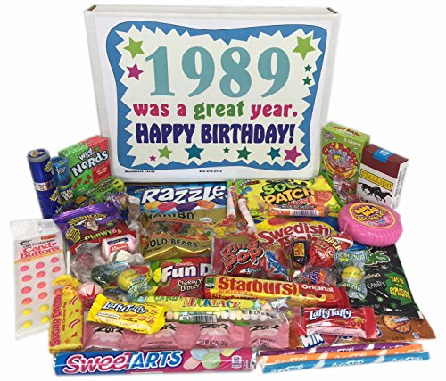 -. Binding : Misc. -. Brand : Woodstock Candy -. Feature : Makes a fun and unique gift for someone celebrating their 28th birthday / Perfect for the person who has everything / Everyone loves candy from their childhood / Box reads "1989 was a great year. Happy Birthday!" / Comes shrink wrapped in a box that measures 11.75" x 9" x 2" -. IsAdultProduct : 0 -. Label : Woodstock Candy -. Manufacturer : Woodstock Candy -. PackageQuantity : 1 -. ProductGroup : Grocery -. ProductTypeName : GROCERY -. Publisher : Woodstock Candy -. Studio : Woodstock Candy -. Title : 28th Birthday Gift Box of Retro Nostalgic Candy from Childhood for a Man or Woman Born in 1989