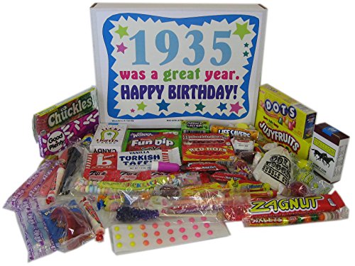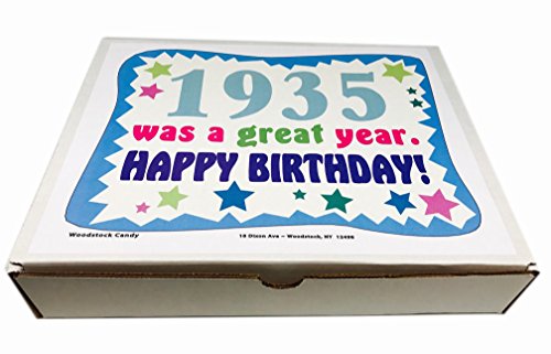 -. Binding : Misc. -. Brand : Woodstock Candy -. Feature : Filled with forty kinds of retro nostalgic candy for a fun birthday gift / 1935 birthday gift box filled with nostalgic candy is sure to bring back great memories / Makes a fun and unique birthday gift for someone born in 1935 / Box reads "1935 was a great year. Happy Birthday!" / This gift will delight any candy lover -. Label : Woodstock Candy -. Manufacturer : Woodstock Candy -. PackageQuantity : 1 -. ProductGroup : Grocery -. ProductTypeName : GROCERY -. Publisher : Woodstock Candy -. Studio : Woodstock Candy -. Title : 82nd Birthday Gift Box of Nostalgic Retro Candy from Childhood for an 82 Year Old Man or Woman Born in 1935