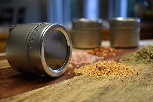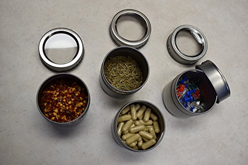 - SIFT and POUR SHAKER LIDS - The magnetic tins feature clear lids for easy identification of contents and feature a sift and pour design. These handy storage jars have a magnetic backing, so they will attach to any flat metal surface, including most appliance and refrigerator doors. The tins are also perfect for store and organize art and craft supplies, rubber bands, screws, paper clips and other small essentials in your kitchen or home office