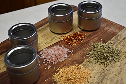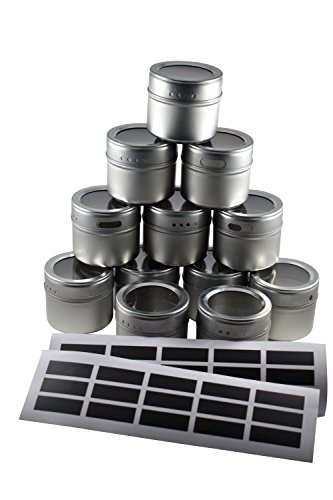 12 Magnetic Spice Tins and 30 Chalkboard Sticker Labels by Ideas by Gigi. Round Storage Spice Rack Set of 12, Clear Top Lid with Sift or Pour. Magnetic On Refrigerator.