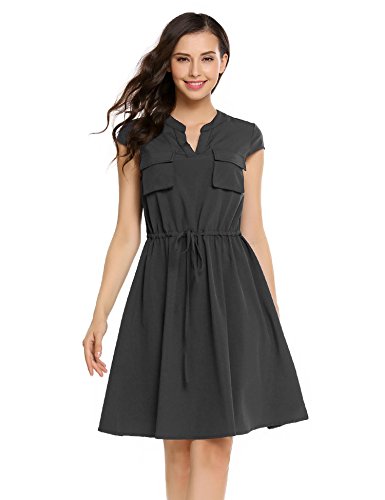 Design - V neck,sleeveless,notched neckline,drawstring waist for a flattering look,chest pockets,casual work wear a line dress
