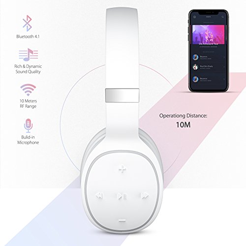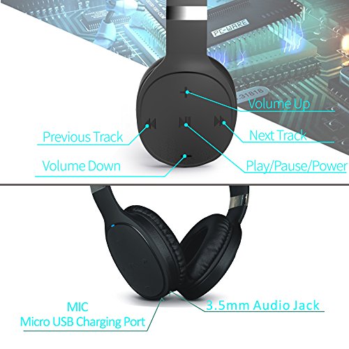 -. Feature : 12+ HOURS OF PLAYBACK TIME: Built-in 200mAh rechargeable battery provides up to 12+ hours of playback/talk time,ENJOY music from your bluetooth headphones after only 2 hours of charging,3.5 audio jack easy to switch to wired/Aux mode anytime with the benefit of no battery required / STYLISH DESIGN:This headphone is adjustable and just only 0.33 lb,ergonomic fit with around the ear design,unique stylish appearance with convenient fordable design make it perfect for indoor and outdoor use,comfortable soft leather earmuffs for prolonged wearing / NOISE CANCELLATION:CVC 6.0 digital noise reduction technology intelligently filters background noise for a much clearer sound for both music and calls.let you enjoy a wonderful music world / HI-FI STEREO PERFORMANCE:Dual 40mm large diameter drivers and a Bluetooth 4.1 chipset offer you exceptional clarity and faster transmission speed,,lower latency and better audio output.,headphone maximizes the bass line for richer sound and higher fidelity / EASY TO USE:CSR Bluetooth 4.1 Chip,and 3.5mm audio jack,provide a quick and stable connection with your Bluetooth enabled devices . the most fast and effective data transmission bring you a fluent feeling when using it.simple and practical function buttons,with the convenience of use