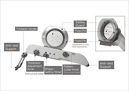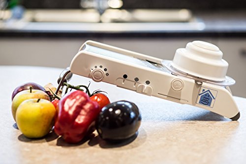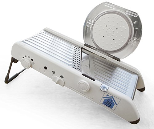 • Professional quality mandolin vegetable slicer. Simple and easy to use. There is no need to replace blades. All thickness adjustments are achieved with the turn of a knob. One knob changes the cutter slicing thickness, the second knob adjusts from straight to julienne slicing and the third changes from straight to waffle cut