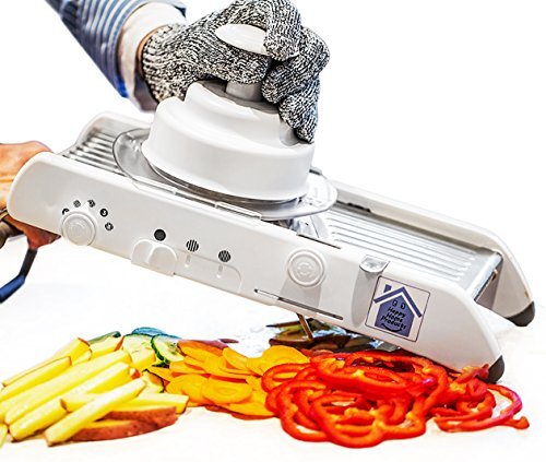 Professional Grade Quality Kitchen mandoline slicer with FREE SAFETY GLOVES. Adjustable Blade with thickness range from 1mm - 7mm. Use for vegetables, fruit, to slice, shred, julienne and waffle cuts.