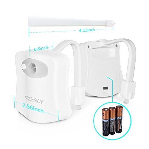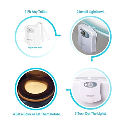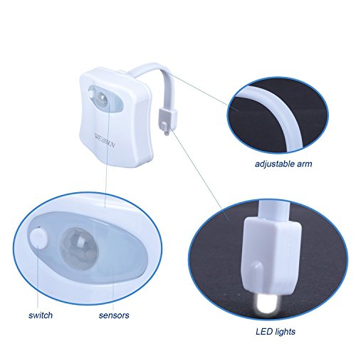 Design Purpose:This LED toilet illuminator combines the vision positioning system of night light, using different colors of light (8 Colors) to indicate the position. With Motion-activated LED sensor, it brightens soft light avoiding stimulate your visual and sleep clocks.What's more, a colorful rainbow toilet will attract your little kid and it helps your lovely kid goes to toilet during night without waking you up.Especially prevent children and the elderly from accidents.