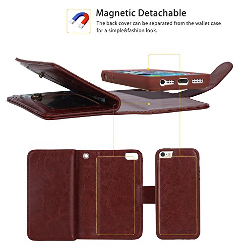iPhone 5 case, iPhone 5s wallet case, BRG [WRISTLET] [6 CARD HOLDER] [MAGNETIC DETACHABLE] PU Leather Folio Flip Credit Card Slots Cash Holder Wrist Strap Case for Apple iPhone 5 5s, 2nd-Brown