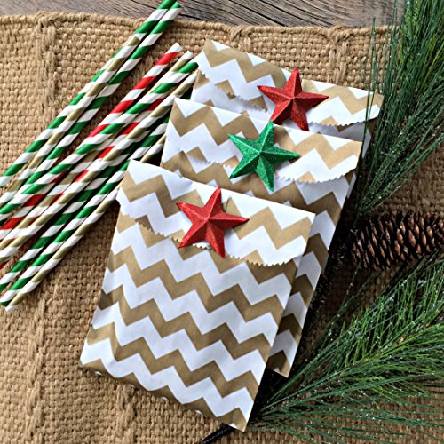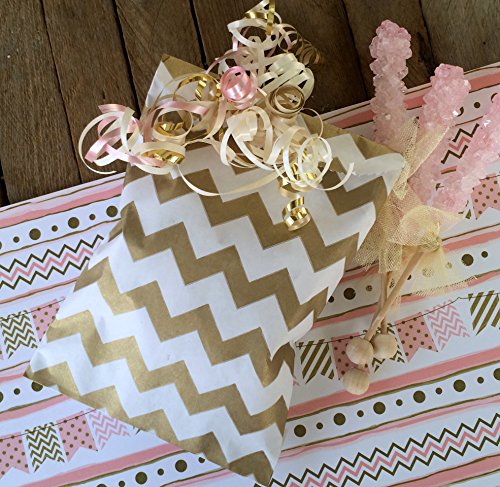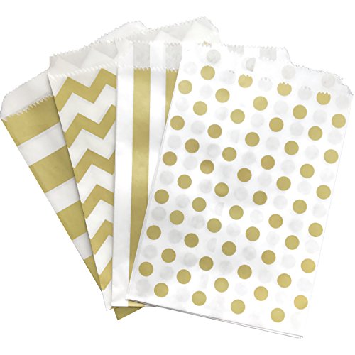 Gold and White Treat Sacks - Chevron Polka Dot Stripe Favor Bags - 5.5 x 7.5 Inches - 48 Pack