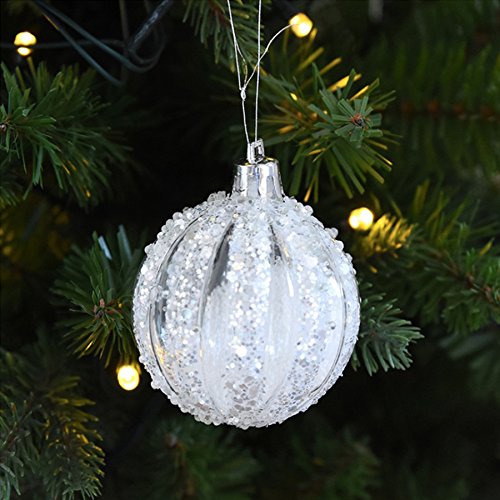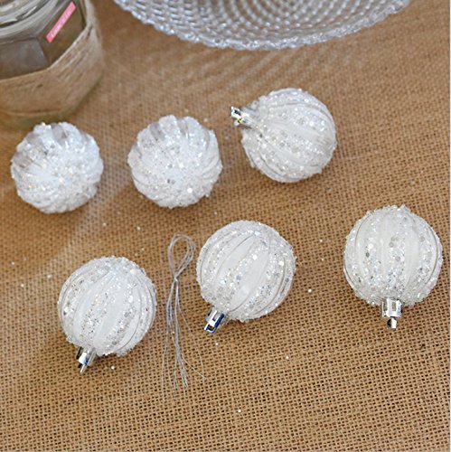 - Balls are equipped with String hangers, filled with fake white snow. Fits perfectly for any normal sized tree in about 4 foot. Hooks are not included.