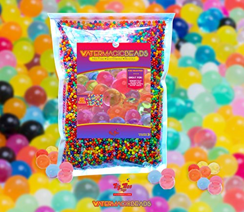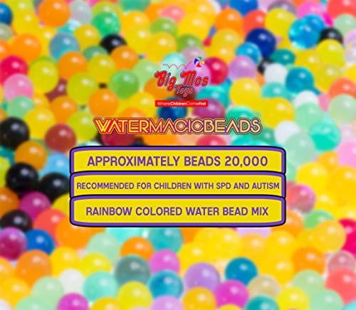 Big Mo's Toys Water Beads come in packs of 8 oz/about 20,000 beads total! Take these colorful beads and put them into water and watch them grow to a few times their size! The finished product is great for kids with Autism or SPD. The soothing tactile effect these beads have, will soothe anyone. These are great vase fillers, to be used as centerpieces for an official event or just standard decor. Made of super absorbent sodium polyacrylate. They are tested for child safety.Feature