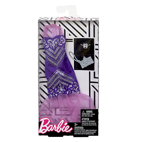 -. Binding : Toy -. Brand : Barbie -. Color : Purple -. EAN : 0887961551389 -. Feature : Barbie doll (sold separately) needs a wardrobe that's ready for any possibility -this fashion pack expands her versatility with one outfit and two accessories to create a complete look / The purple gown has a glittery print, pink sheer shoulders and matching mermaid hem / A silvery clutch and bangle complete the look / Mix and match with other Barbie doll clothing to spark imaginations and storytelling fun (each sold separately, subject to availability) / More variety makes collecting Barbie dolls and fashions even more fun -collect them all! -. Label : Mattel -. Manufacturer : Mattel -. Model : FKT04 -. MPN : FKT04 -. NumberOfItems : 1 -. PackageQuantity : 1 -. PartNumber : FKT04 -. ProductGroup : Toy -. ProductTypeName : TOYS_AND_GAMES -. Publisher : Mattel -. ReleaseDate : 2018-01-29 -. Studio : Mattel -. Title : Barbie Complete Fashion Looks Mermaid Gown, Purple -. UPC : 887961551389 -. Warranty : 1 year warranty against manufacturer defects