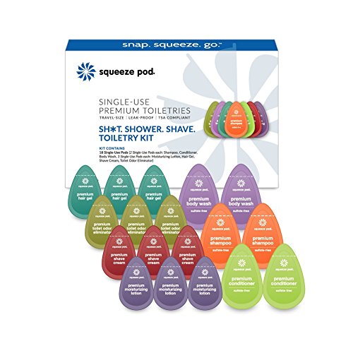 In life, there's a time for leisure and a time for getting down to business. And when you're traveling, it's usually the latter. So let's talk life. The essentials. The testosterone trifecta: You've got your shower; you've got your shave; and yeah, you've got your daily business. These things are crucial, and you value your daily routine. We've got you covered. Grab our Sh*t Shower Shave kit, and you can do your business whenever, wherever - even in a public restroom, at the office, in the gym, or as you fly, teetering over a mile-high toilet in a bathroom too small for a toddler. The Sh*t Shower Shave Toiletry Kit includes * Shampoo (2 single-use pods) - Vanilla Lavender Scent * Conditioner (2 single-use pods) - Vanilla Lavender Scent *Body Wash (2 single-use pods) - Vanilla Lavender Scent * Hair Gel (3 single-use pods) - Fresh Clean Scent * Shave Cream (3 single-use pods) - Fresh Lemon Pine Scent * Moisturizing Lotion (3 single-use pods) - Grapefruit Bergamot Scent and * Toilet Odor Eliminator (3 single-use pods) - Fresh Eucalyptus Scent.Feature