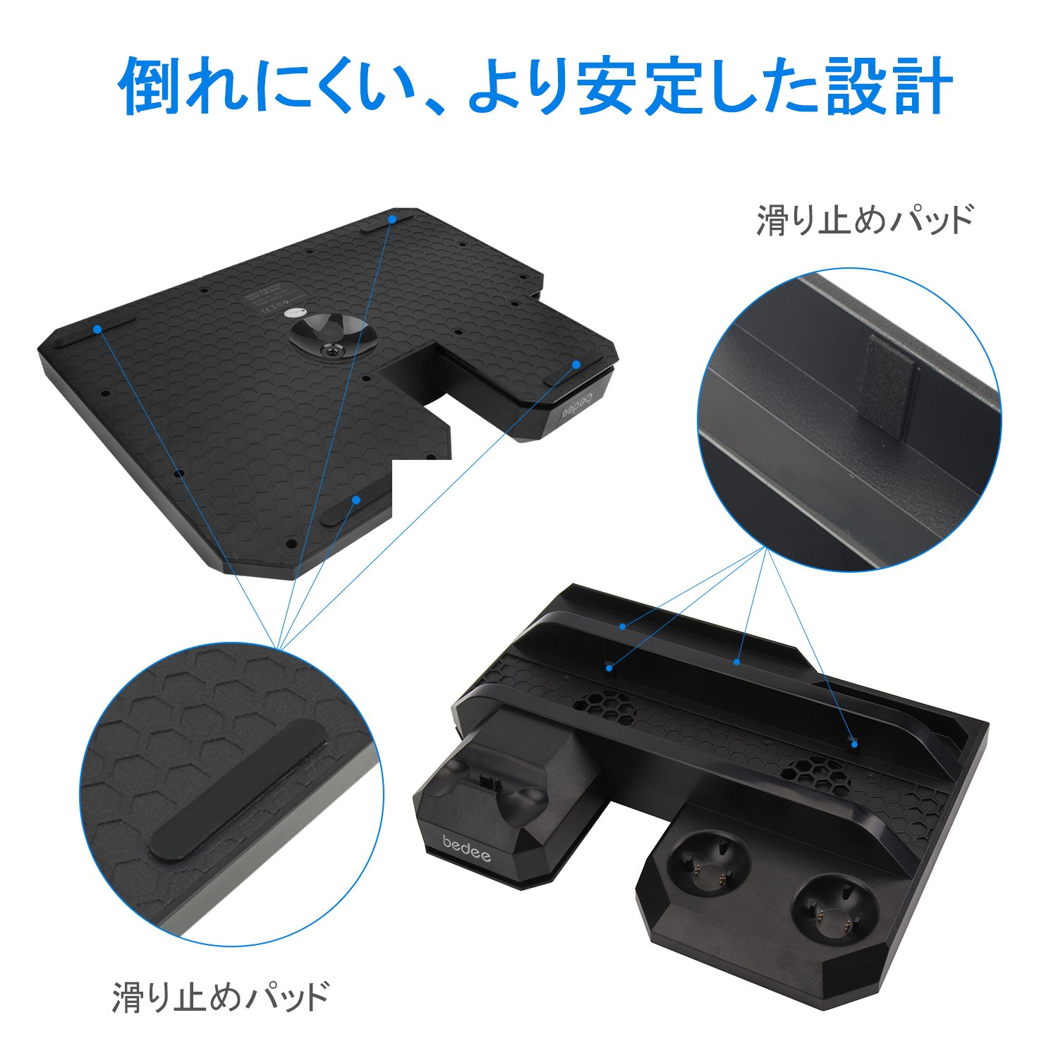 PS4/PS4 PRO/PS4 SLIMがピッタリとはまり,横幅が広く安定感抜群の縦置きスタンドとしてご利用いただけます。さらに側面と底面に滑り止めのゴムを配置して、安定性を確保しています。