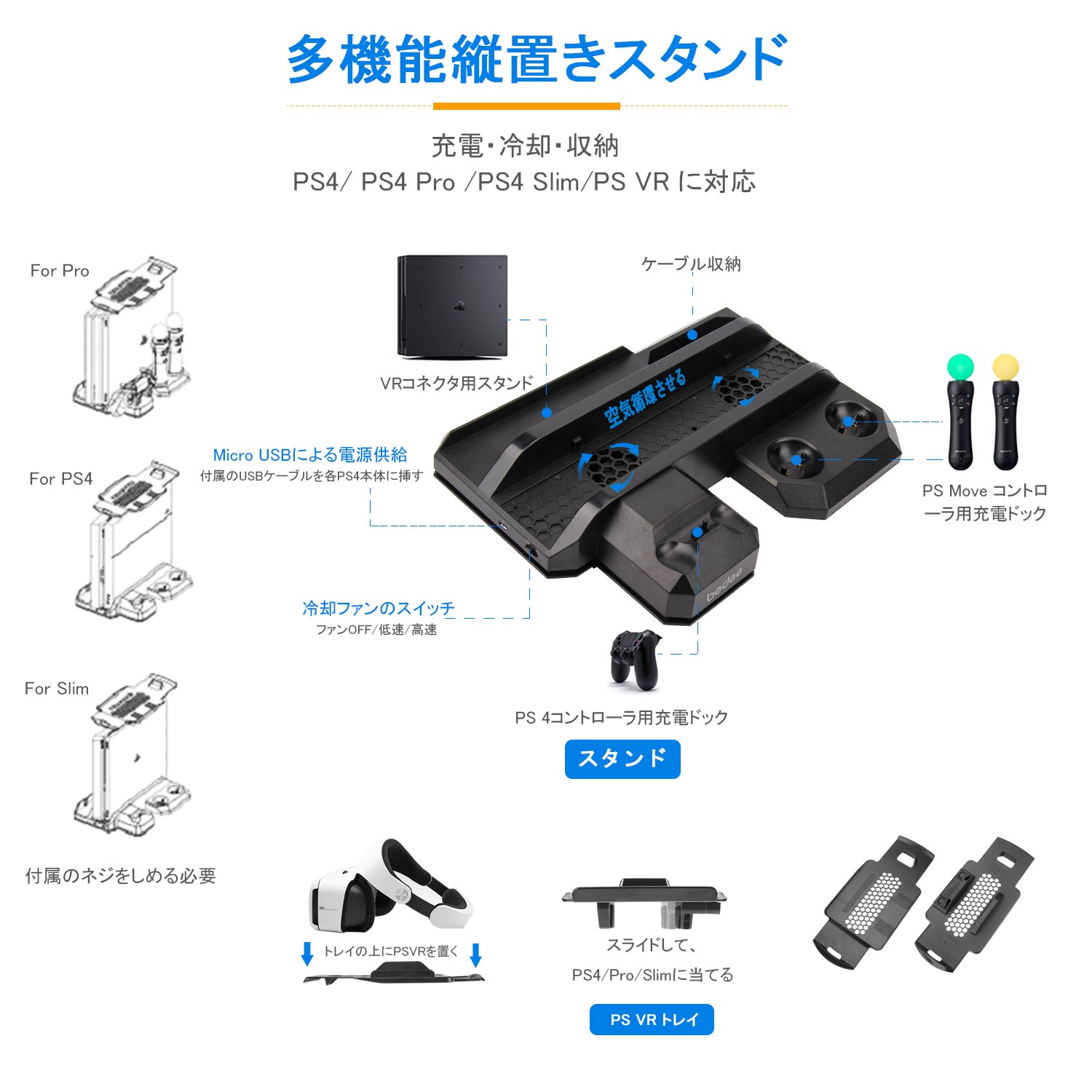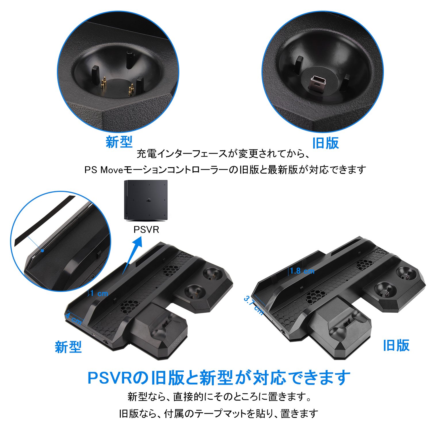 - 【全部収納】PS4やPS4 ProやPS4 SlimやPS VRやPS4コントローラーやPS Moveモーションコントローラーなどを一カ所にまとめられます。新型PSVRとPS Moveモーションコントローラーの最新版スタンドも使えます。無い状態での縦置きは非常に危険ですし、横置きは場所をかなり取りますので、縦置きにすれば、しっかり支えてスペースを節約します。