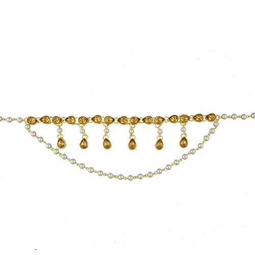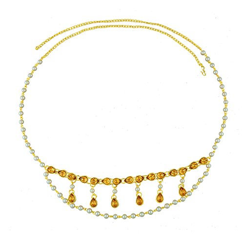Binding : Jewelry Product Description Golden finish designer kamar-patta from Anuradha Art Jewellery will strike you at very first look. It is decked with sparkling golden stones and made from metal. This waist chain has pearl beaded strings and has droplet for added attraction. It is easy to use and comfortable to hold all day long. So order now! 0