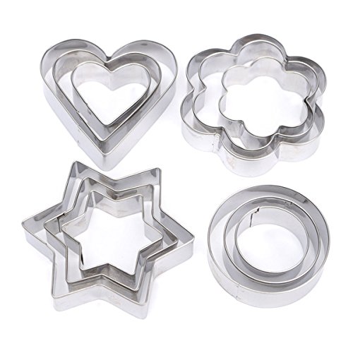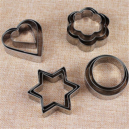 -. Feature : Color: Silver / Material: Stainless Steel / 12Pcs Cookie Cutters / (Including 3*Heart, 3*Flower, 3*Star, 3*Circle) / Cake & Cookie Cutters