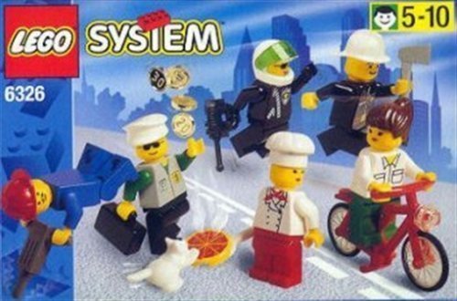 This 29 piece set contains 6 classic town mini figures - police officer, firefighter, construction worker, chef, banker, and cyclist. Each comes with their own prop - pizza, briefcase, gold coins, bicycle, and more! This hard to find set was made in 1998.