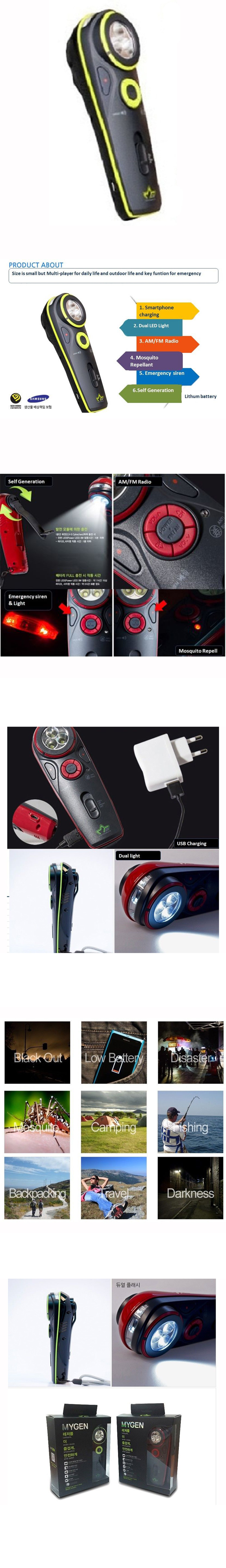 MYGEN Multi-fuction 6in1 Emergency Kit rechargable dual Light radio siren mosquito repellant smartphone charger & generator Must have item on outdoor activity Smartphone charging/Dual LED Light/AM/FM Radio/Mosquito Repellant/Emergency Siren/Self Generation Battery : 1000 mah lithium battery / ( Using time full charge ): light 7 hr,radio 2 1/2 Hr Componant : main body ,USB charging cable 2 pin adapter Korean manual Size: 155 * 54*50 mm / Weight : 185 g