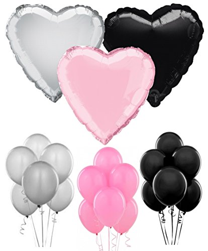 (3) 18" Heart Shaped Mylar Balloons ~ Colors As shown (6) 11" Pink Latex Balloons (6) 11" Black Latex Balloons (6) 11" Silver Latex Balloons