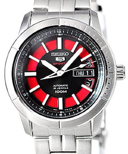 -. Title : Seiko 5 Black And Red Dial Stainless Steel Mens Watch SRP339