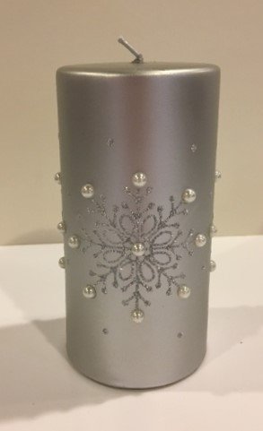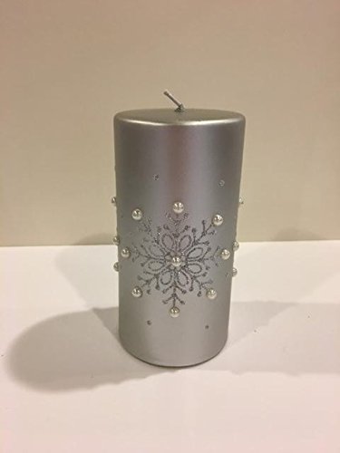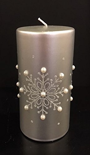 Luna Lumia Decorative Silver Pillar Candle with White Snowflakes And Pearls Design, No-Drip Smokeless Wax Candles. Relaxing & Romantic Atmosphere. Excellent Gift Idea!
