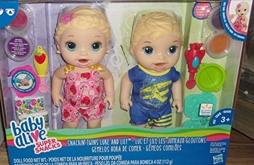 -. Title : Baby Alive Super Snacks Snackin Twins Lily Girl Doll and Luke Boy Doll Blonde NEW With Accessories