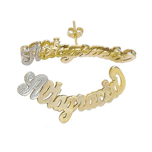 -. Feature : Handcrafted 32mm script letters curved Name Earrings. Pave Cut finish on First letter. Double Plate w/ Push Back Post. / Size of name : 32 X 8mm with 2.8mm ( 3D) thickness. / Made out of 10K Yellow Gold. / *YOU MUST PROVIDE*(MESSAGE US INFO) / 1. Name (upto 8 characters)