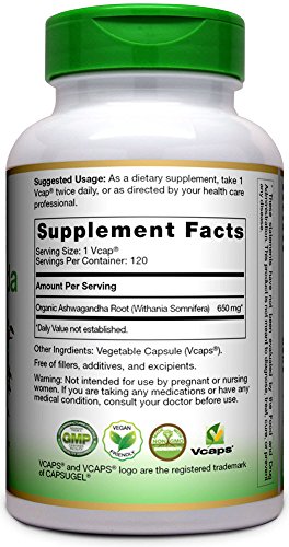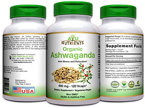 -. Title : AyuNutrients Organic Ashwagandha -650 MG-2 Veggie Capsules Per Serving -120 Count | Made in USA | Supports Resistance to Fatigue,Relieve Stress, Mental Clarity,Focus,Strength and Vitality.