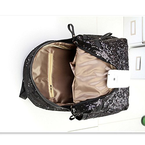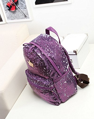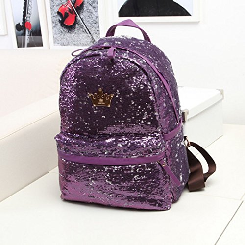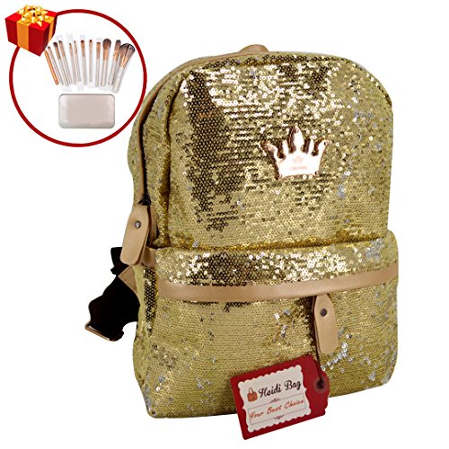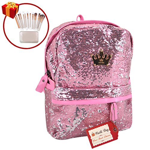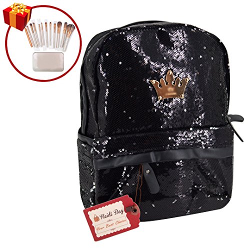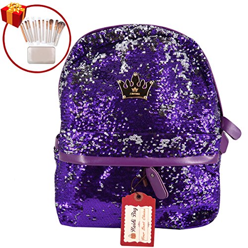 Material: sequin, PU leather and polyster lining Color: Gold/Pink/Purple/Black Size: 10.2*5.1*12.5in Closure: zipper Suitable For: girls and ladies Package including: one backpack and a makeup brushes set