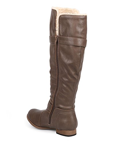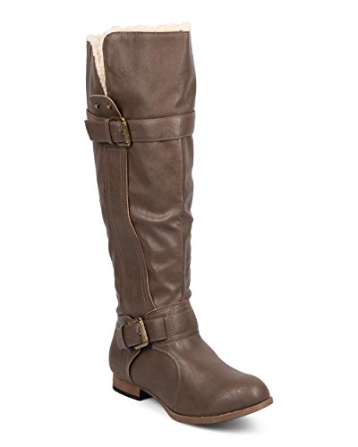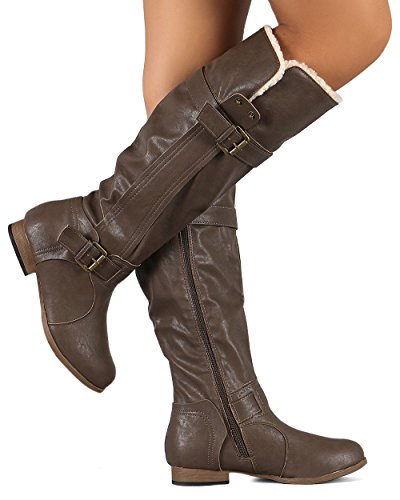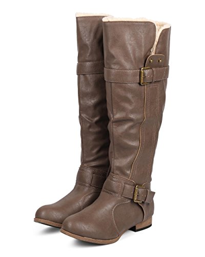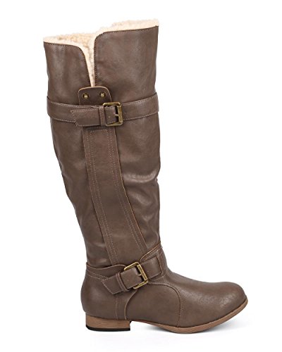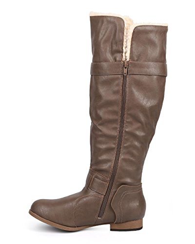 (Wild Diva)/Women's/Boots/DIRECT FROM USA/Wild Diva DB38 Women Leatherette Knee High Shearling Buckle s trap Riding Boot - Taupe / Grey