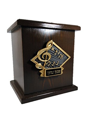 Product Description Beautiful solid wood urn. Comes with 5" x 7.5" musical 3D plaque with a 1.5" x 4.25" plate. Engraving on the plaque is included. Please use the option to customize product before adding it to cart. *Secure bottom opening * Outside dimensions: 9.5"x 8.5" x 7" * 250 cubic inch capacity FULL SIZE ADULT URN 0