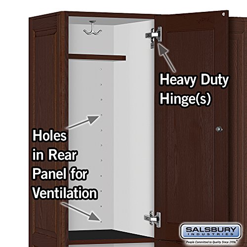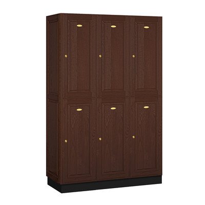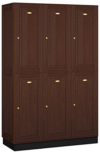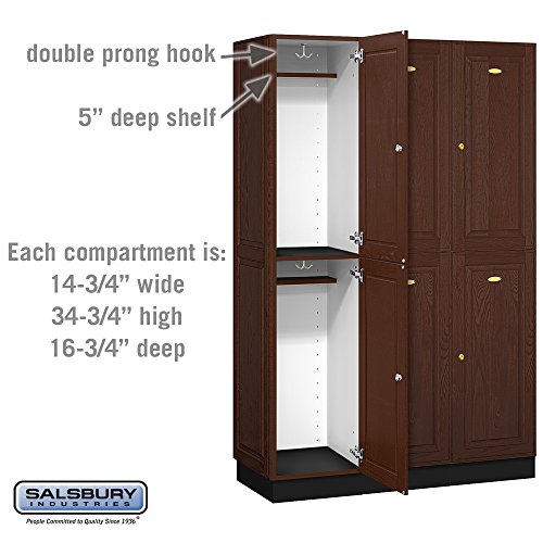 Salsbury 12000 Series Double Tier Solid Oak Executive Wood Lockers are constructed with attractive solid oak raised panel doors. Solid oak executive lockers combine the strength and durability of solid wood with the natural beauty of oak. Ideal for health clubs, locker rooms, country clubs, day spas, golf clubs or wherever a professional environment is desired. Available in a light oak, medium oak or dark oak finish and include a gold finish name/number plate. Solid oak executive lockers include a black laminated base and are 6 feet high (add 4" for base). 18" deep solid oak executive lockers have a compartment size that is 14-3/4" wide, 34-3/4" high and 16-3/4" deep. 21" deep solid oak executive lockers have a compartment size that is 14-3/4" wide, 34-3/4" high and 19-3/4" deep. 24" deep solid oak executive lockers have a compartment size that is 14-3/4" wide, 34-3/4" high and 22-3/4" deep. Each compartment includes a 5" deep shelf and a double prong ceiling hook. Available as 1 wide or 3 wide units. 1 wide units come fully assembled while 3 wide units require minor assembly. All locker doors are 16" wide x 3/4" deep and include a gold finish cylinder cam lock with 2 keys. Salsbury Industries is an ISO 9001: 2008 certified company and has excelled in the field of manufacturing since 1936.Feature
