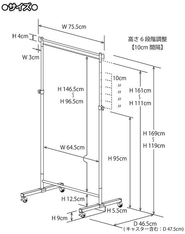 | サイズ | W75.5×D47.5×H119~169cm(キャスター含む) 個装サイズ:92×18×9cm |