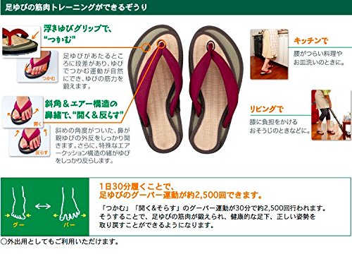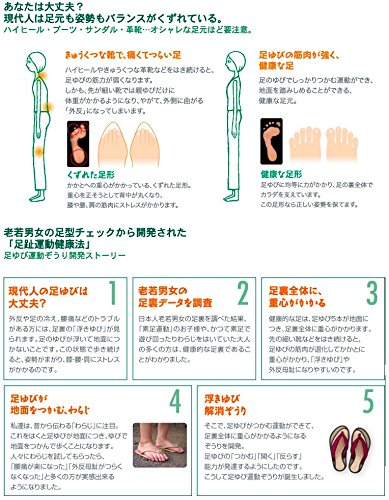 足に合わない窮屈なハイヒール、パンプス、革靴、を履き続けると、足ゆびの筋力低下を招き、「親ゆびの外反」や、ゆび先が地面に付かない「浮き趾(ゆび)」の原因になります。さらに足ゆびの筋力の低下が進むと姿勢バランスが崩れて、膝、腰に過度なストレスがかかります。足ゆびの筋力の低下は成人約2人に1人、幼稚園児約8割 に見られます。「足ゆび運動ぞうり楽」は30分履いて歩くだけで、足ゆびのつかみ運動(ギャザー運動)で2,500回鍛えたのと同じ効果を得られます。※6,000人の足形測定による弊社調査データFeature