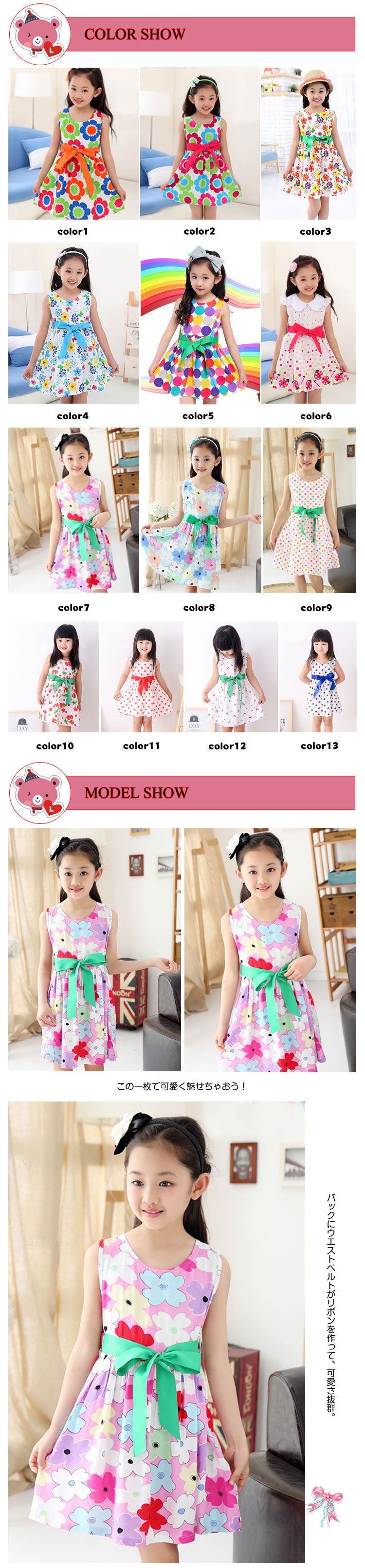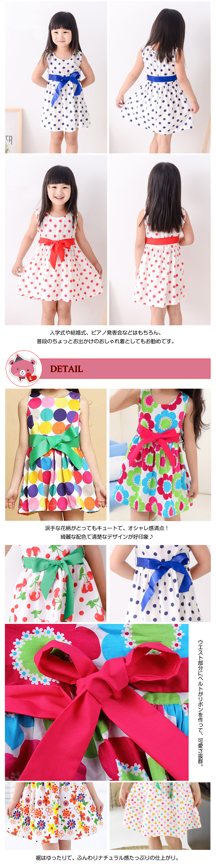 | この一枚で可愛く魅せちゃおう!綿素材できちんと感があります。真夏にサラリと着たい爽やかなワンピースです?バックにウエストベルトがリボンを作って、可愛さ抜群。派手な花柄がとってもキュートで、オシャレ感満点!綺麗な配色で清楚なデザインが好印象?肌触りの優しい素材で気持ちよくて嬉しいのがポイント。ノースリーブの袖デザインが爽やかなな雰囲気に魅せてくれる。入学式や結婚式、ピアノ発表会などはもちろん、普段のちょっとお出かけのおしゃれ着としてもお勧めです。 | |