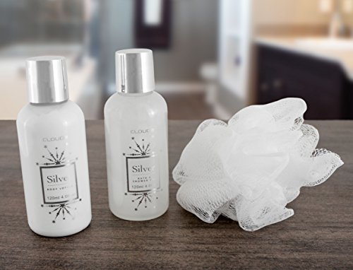 - The gift set includes 6.8 fl.oz (200 ml) shower gel, 6.8 fl.oz (200 ml) body lotion and an exfoliating sponge made of nylon.